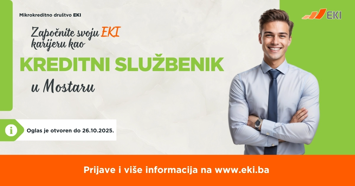 Mikrokreditno društvo EKI poziva vas da postanete naš novi Kreditni službenik, stvarajući poslovne prilike i pozitivne promjene u zajednici. Uz nas, vaša karijera neće biti samo posao, nego putovanje prema uspjehu i zadovoljstvu.