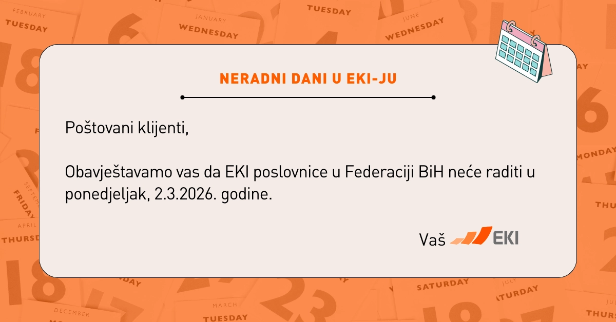 Obavještavamo vas da EKI poslovnice u Federaciji BiH neće raditi u ponedeljak, 02.03.2026. godine.